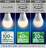 ●まとめ買いが断然お得です! 三菱化学メディア Verbatim LED電球 一般電球タイプ 口金E26 電球色 6.8w 550ルーメン 明るさ3段階切り換え LDA7L-H/3S![]() 価格: 800円 ◆明るさ切り替えで、超節電明るさ3段階切り換えLED。スイッチをON←→OFFするだけで、明るさ切り換え。(調光器具は不要です。)一度スイッチをOFFにしてから3秒以内に再点灯すると明るさが切り換わります。・STEP1スイッチON→通常モード(100% 明るさ:550lm、消費電力:6.8W)・STEP2スイッチOFF→3秒以内にスイッチON→節電モード(60% 明るさ:330lm、消費電力:4.0W)・STEP3スイッチOFF→3秒以内にスイッチON→超節電モード(20% 明るさ:110lm、消費電力:1.4W)※消灯後、4秒以上経過し、再点灯すると100%の明るさで点灯します。◆定格寿命: |